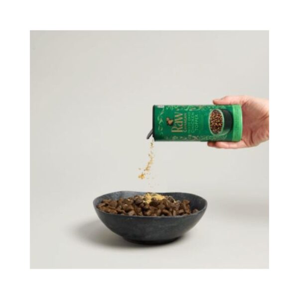 Canagan Raw Topper è un alimento progettato specificamente come complemento ai pasti; è ideato per essere cosparso sulla razione di cibo secco o umido del tuo cane al fine di aumentarne l’appetibilità, fornendo al tempo stesso un ulteriore apporto nutrizionale e risultando particolarmente utile in caso di animali dal palato particolarmente esigente.