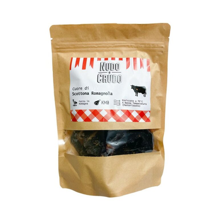 Crudité Cuore di Scottona Romagnola è un alimento complementare ideale per premiare il tuo pelosetto con uno snack genuino e gustoso. Il cibo barf disidratato per cani è realizzato esclusivamente con carne romagnola KM 0 essiccata a basse temperature, garanzia di gusto e qualità impareggiabile!