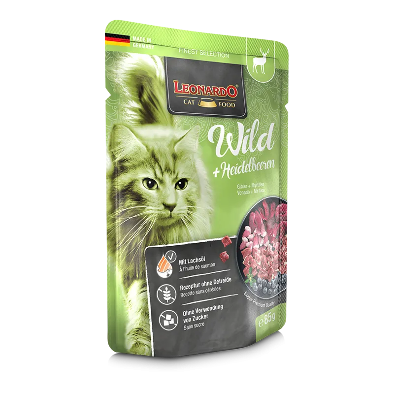 Selvaggina con mirtilli: carne di selvaggina magra della migliore qualità, raffinata con pollame di alta qualità per un sapore extra e completata da mirtilli fruttati: LEONARDO Selvaggina + Mirtilli è una festa per il palato che delizierà le zampe di velluto. E per un pelo lucido: grazie all'olio di salmone, che fornisce acidi grassi polinsaturi.