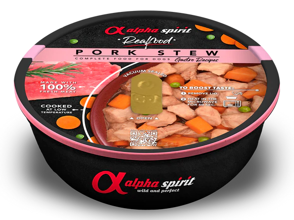 97% carne di maiale fresca nella sua salsa, piselli, carote, patate dolci, spezie.